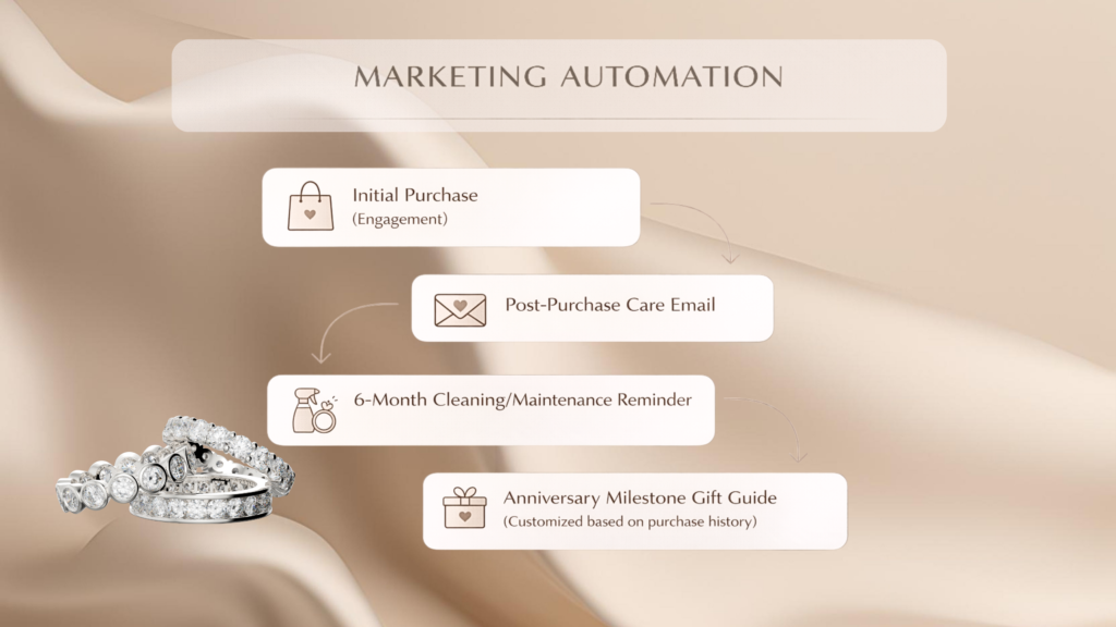 - Automated Workflows: Deploy sequences for abandoned carts, post-purchase care instructions, and anniversary reminders through Marketing Automation.
